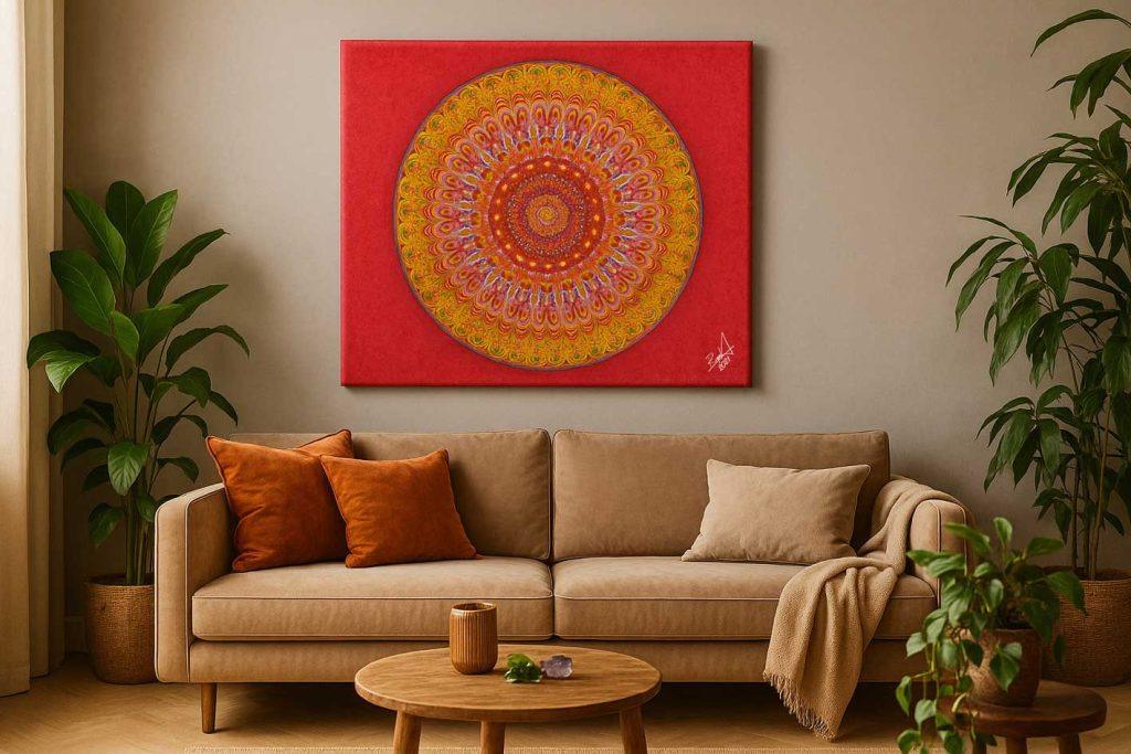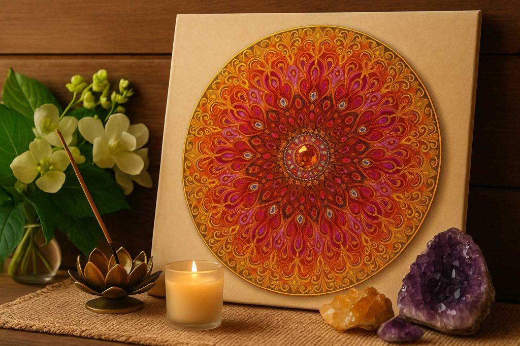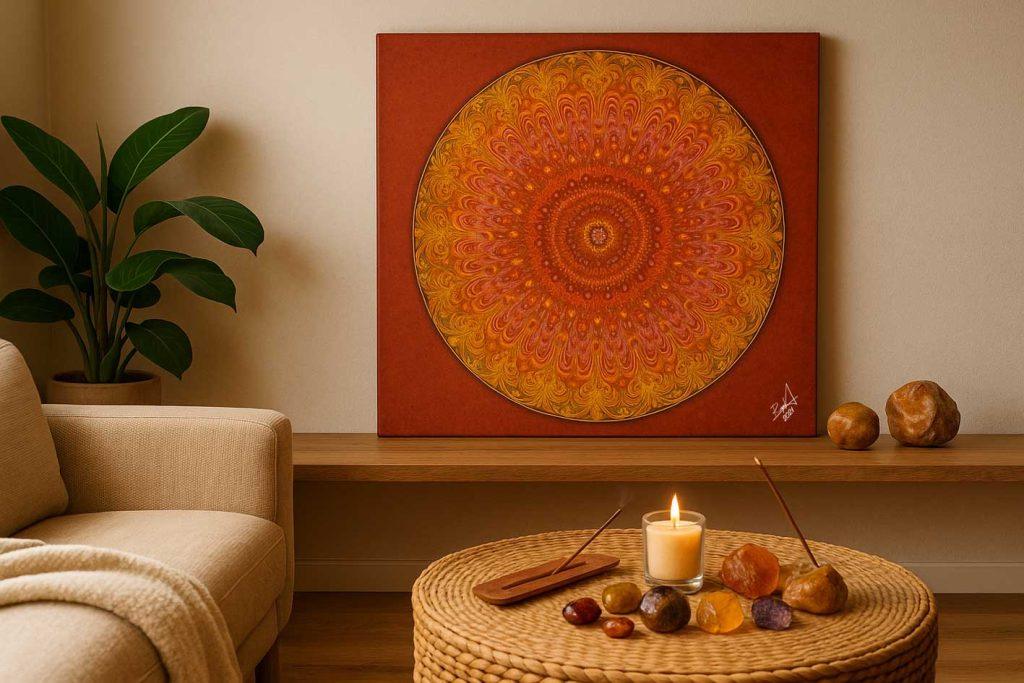 Mandalu můžeš umístit tam, kde nejvíce potřebuješ rozsvítit svůj vnitřní prostor. Hodí se na oltář, do pracovny nebo do místa, kde tvoříš.